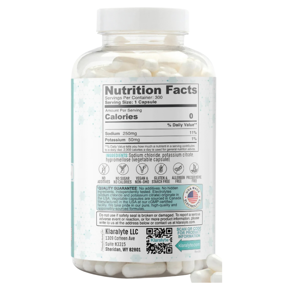 Klaralyte te ofrece cápsulas de sal de primera calidad con una fórmula científicamente balanceada, diseñada para su uso diario con 250 mg de sodio y 50 mg de potasio en una cápsula vegetariana fácil de digerir. Electrolitos fabricados en EE. UU. Sin aditivos.