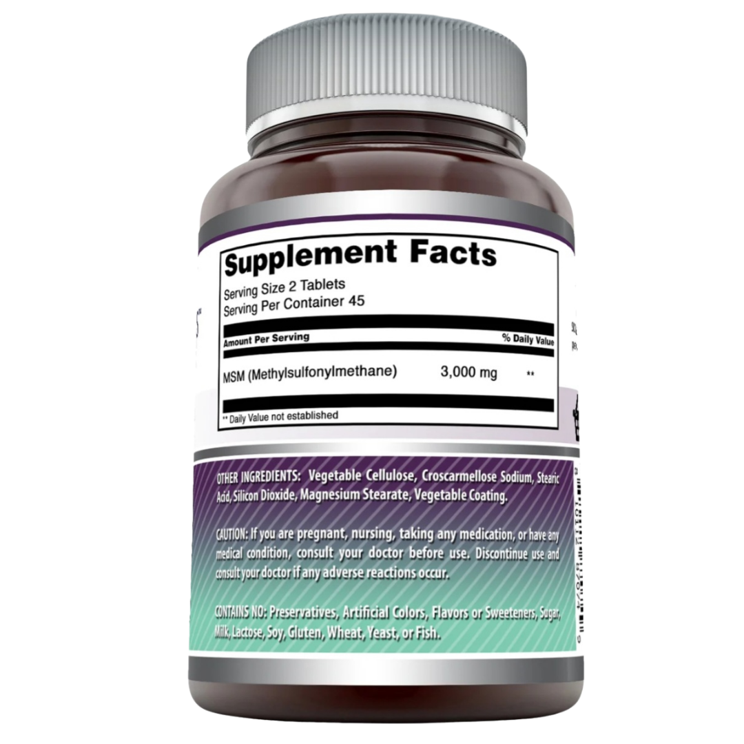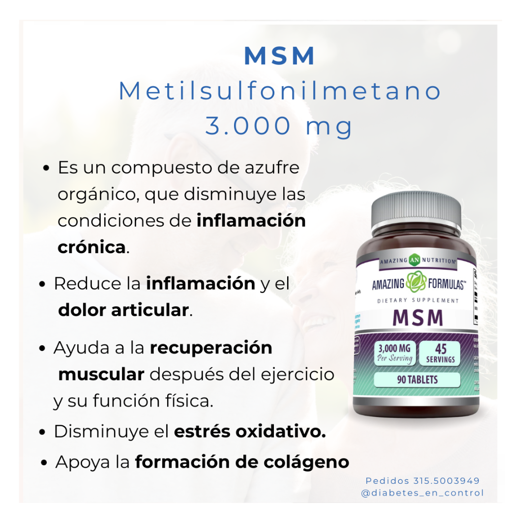 El MSM es un compuesto orgánico que contiene azufre y que se encuentra de forma natural en pequeñas cantidades en alimentos como verduras, frutas, granos y leche, así como en el cuerpo humano. Se utiliza comúnmente como suplemento dietético.