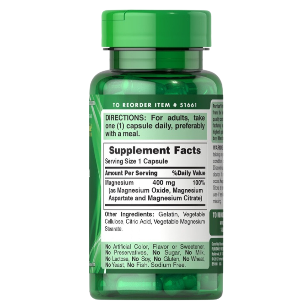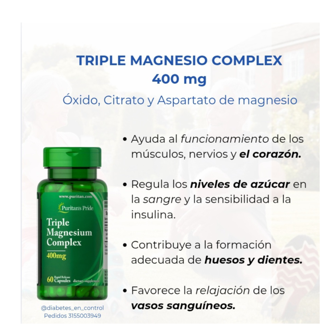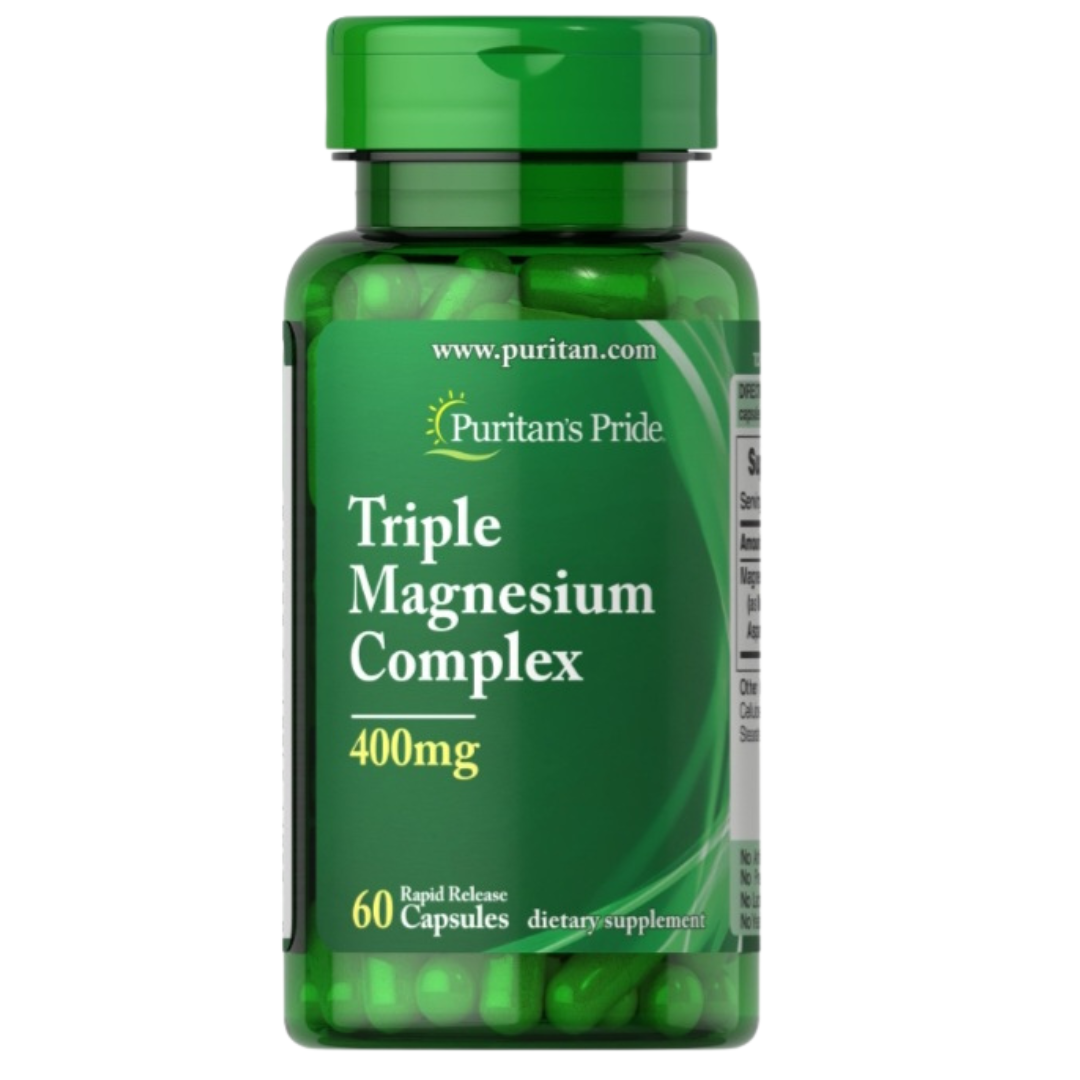 Triple Magnesio Complex ayuda a mantener huesos sanos en adultos. Este suplemento dietético apoya la salud ósea y desempeña un papel en la regulación del calcio. Cada cápsula tiene 400 mg de nuestro complejo de magnesio que consta de óxido de magnesio, aspartato de magnesio y citrato de magnesio. Incluye 60 cápsulas de liberación rápida.